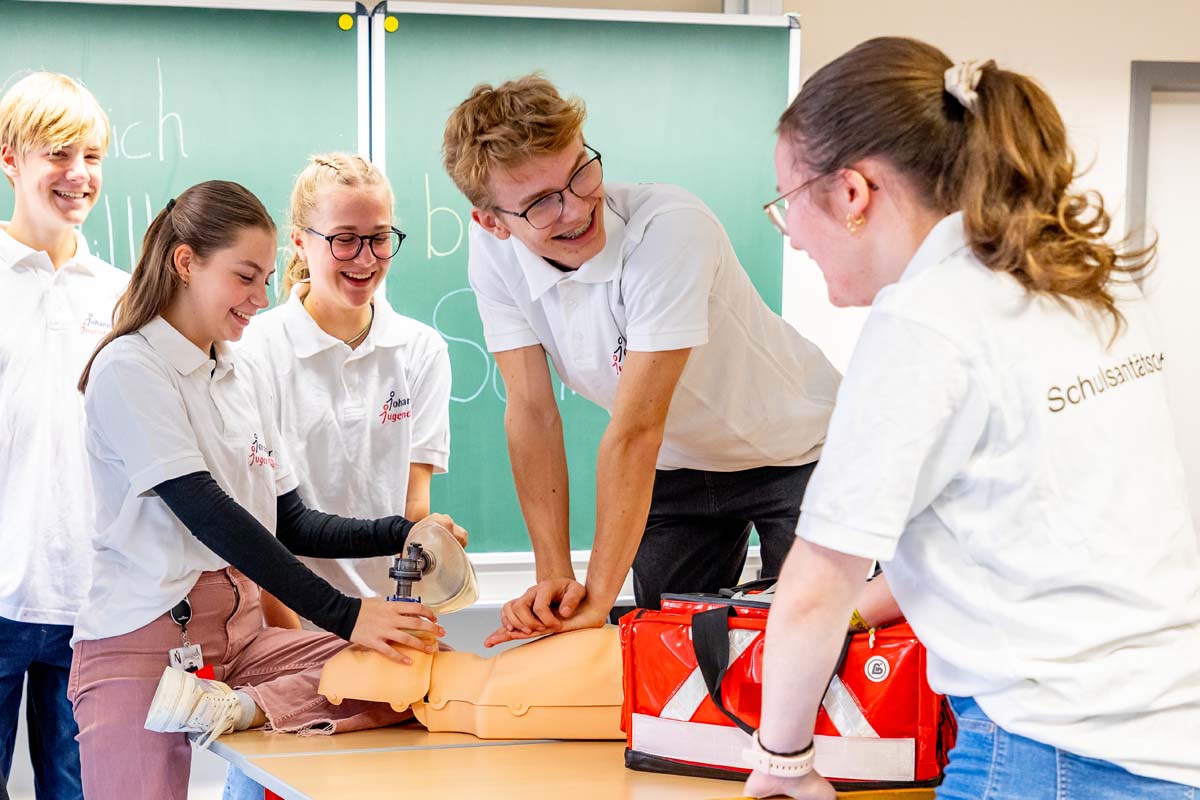 - Sanitäts-AG: Hier werden die Teilnehmenden in Erster Hilfe ausgebildet, übernehmen im Schulalltag Verantwortung und verfügen über einen eigenen Sanitätsraum.