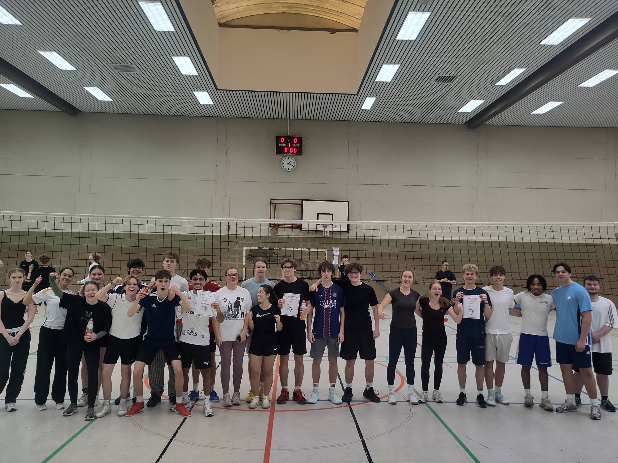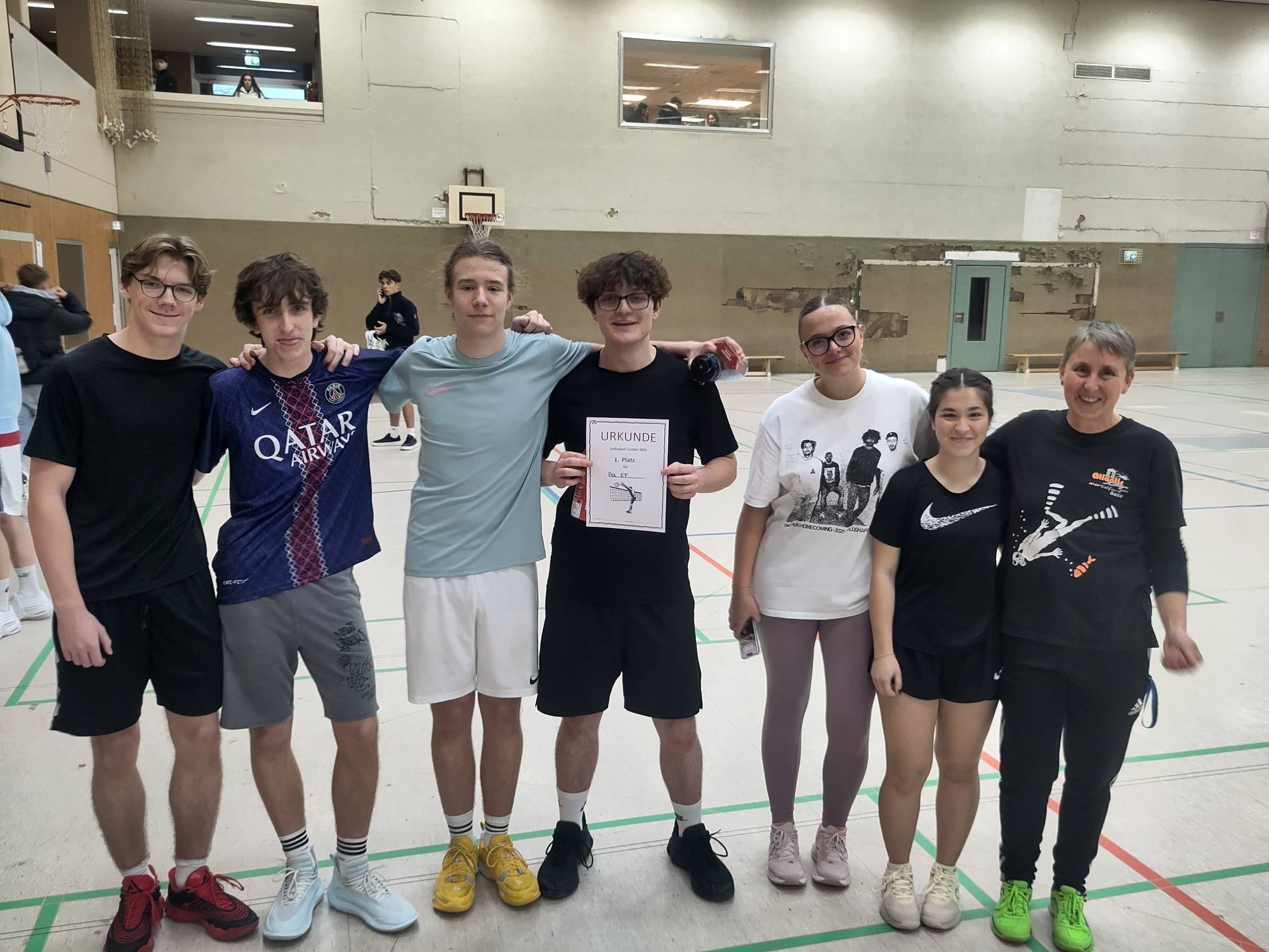 Dieses Jahr schaffte der EF Kurs von Frau Polakovic das fast Unmögliche. Sie wurden Sieger des Turniers am Vormittag (10er und EF), qualifizierten sich damit für die Teilnahme am Nachmittagsturnier (Q1, Q2, Altschüler) und gewannen erneut. Sie sind damit der Gesamtsieger des Turniers geworden.